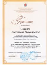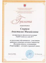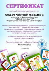 | Курсы повышения квалификации | 2025 г. ЧОУ АБиУС "Организационно-методическая деятельность инструктора по физической культуре в ДОО в условиях реализации ФГОС", 72 ч. |